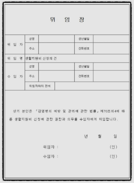 3.가족이나 대리인 신청할 경우 대리인 격리자 신분증, 본인 신분증을 지참해 주민센터에 방문하셔서 위임장을 작성하시면 됩니다.