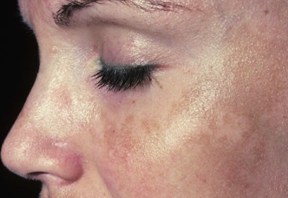 여러가지 크기와 뚜렷한 다갈색, 암갈색의 색소반으로 이마나 볼 좌우에 대칭적으로 나타나며 형태는 불규칙하며 크기는 손가락 끝부분의 크기에서 부터 손바닥 크기에 이르는 것까지 있다고 합니다.