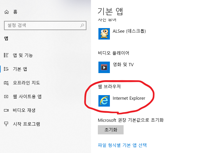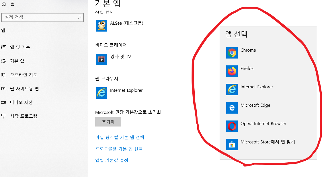 6. 마지막으로 앱 선택 화면이 나오며 여기서 익스플로러를 선택하면 완료가 됩니다. 만약 자신은 크롬을 하고 싶다면 크롬이나 파이어폭스 등 자신이 원하는 브라우저를 선택하시면 됩니다.