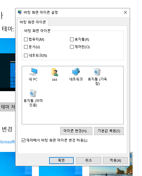 6. 여기서 불러오고 싶은 바탕화면 아이콘을 체크하여 하단에 적용후 확인을 눌러 줍니다.