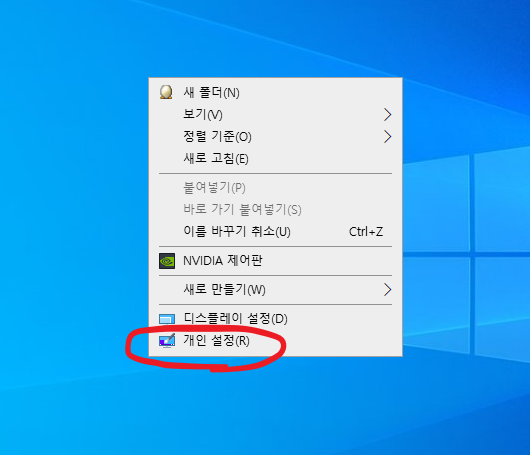 1. 우선 바탕화면에서 마우스 오른쪽을 클릭해 보면 밑에 사진처럼 메뉴창이 나타납니다. 메뉴창에서 제일 하단에 개인 설정을 클릭해 줍니다.
