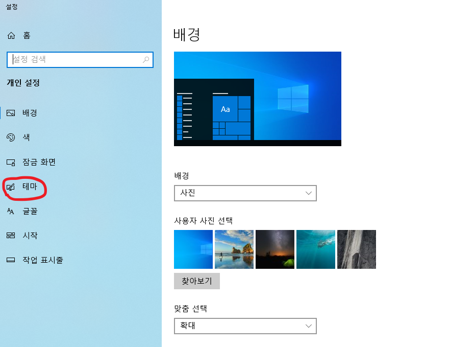 2. 그러면 배경 설정창이 나타나게 됩니다. 여기서 왼쪽 메뉴중에 테마를 클릭해 줍니다.