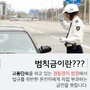 범칙금이란 일상생활에서 일어나는 경미한 경범죄(노상방뇨, 무단횡단, 담배꽁초 버리기) 등에 대해 부과하는 것을 말하며 예를 들어 운전중 도로 교통법을 어겨 경찰관에게 적발되었을때 부과하는 벌금을 말합니다. 과태료와 다른 점은 차량의 명의자와 상관없이 적발시 차량을 운전하던 자에게 부과된다는 점입니다.