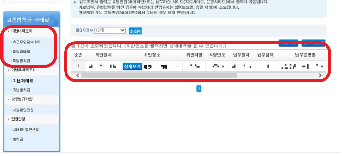4. 로그인 하시면 미납범칙금 페이지가 나오며 여기에서 위반에 대한 자세한 내용을 알수가 있습니다. 미납범칙금은 계좌이체나 신용카드로 결제가 가능합니다.