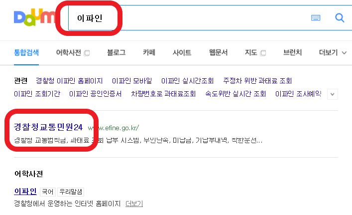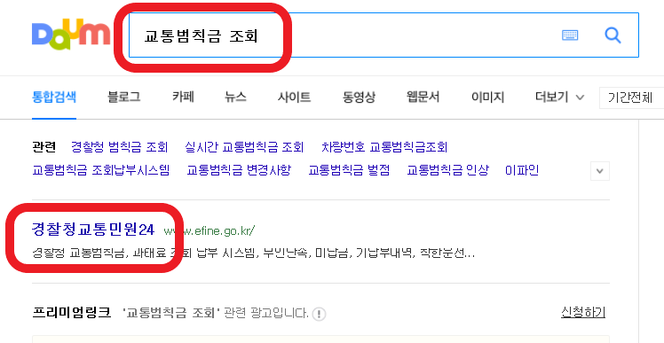 1. 다음같은 포탈검색 창에 이파인이나 교통범칙금 조회로 검색해 줍니다. 그러면 밑에 경찰청 교통민원24 라는 사이트가 나옵니다. 그곳을 클릭해서 들어가시면 됩니다.