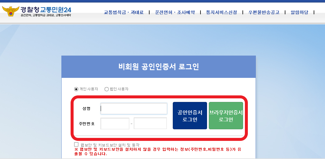 3. 로그인 창이 열리는데 여기서 공인인증서 로그인을 하시거나 브라우저 인증서로 로그인 해주시면 됩니다.