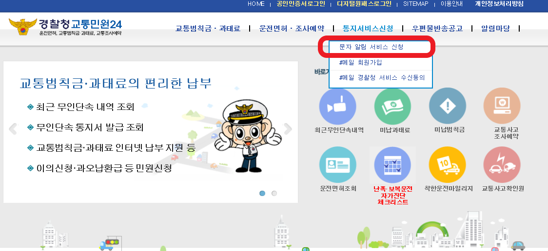 교통범칙금 벌점은 경찰청민원24 홈페이지에서 운전면허 벌점 조회가 가능하며 한가지 팁으로는 과속이나 교통 위반을 했을시 문자로 알려주는 서비스가 있습니다. 필요하신 분들은 문자 알림 서비스 신청을 해두시면 좋습니다.