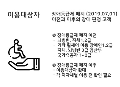 2. 장애등급제 폐지 이후 대상자는 장애판정을 받고 휠체어 사용하시는 분들로 점더 이용대상자를 확대하였으며 자세한 사항은 각 지자체에 이용 전 확인할 필요가 있습니다.