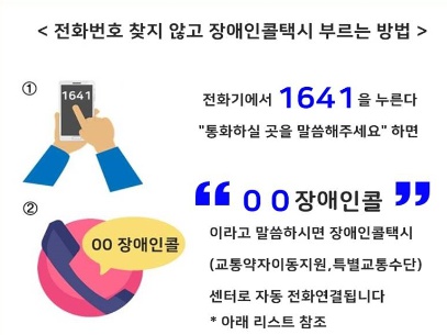 각 지역마다 장애인 콜택시 전화번호가 다르므로 간편하게 장애인 콜택시로 전화 연결을 할려면 말로거는 전화 1641로 전화하면 음성으로 통화하실 곳을 말씀해주세요 라고 합니다. 그리곤 OO 장애인 콜 이라고 말하면 해당 지역 콜센터로 연결됩니다.