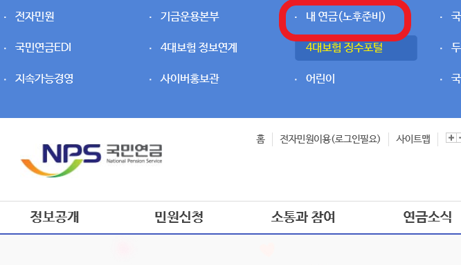 1. 국민연금 홈페이지 상단에 내연금(노후준비)를 들어가 줍니다.