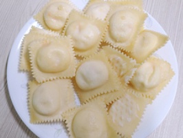 라비올리는 반달이나 네모로 만든 만두 모양이며 속 재료는 생선이나 고기, 치즈 등 다양한 재료를 넣어 만든다고 합니다.